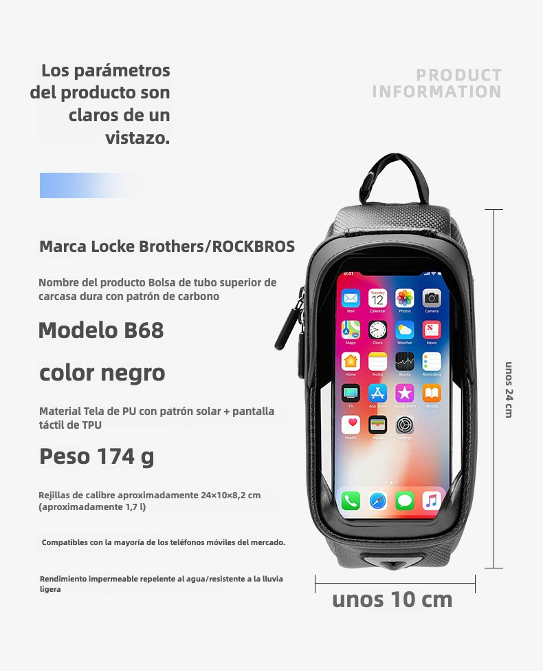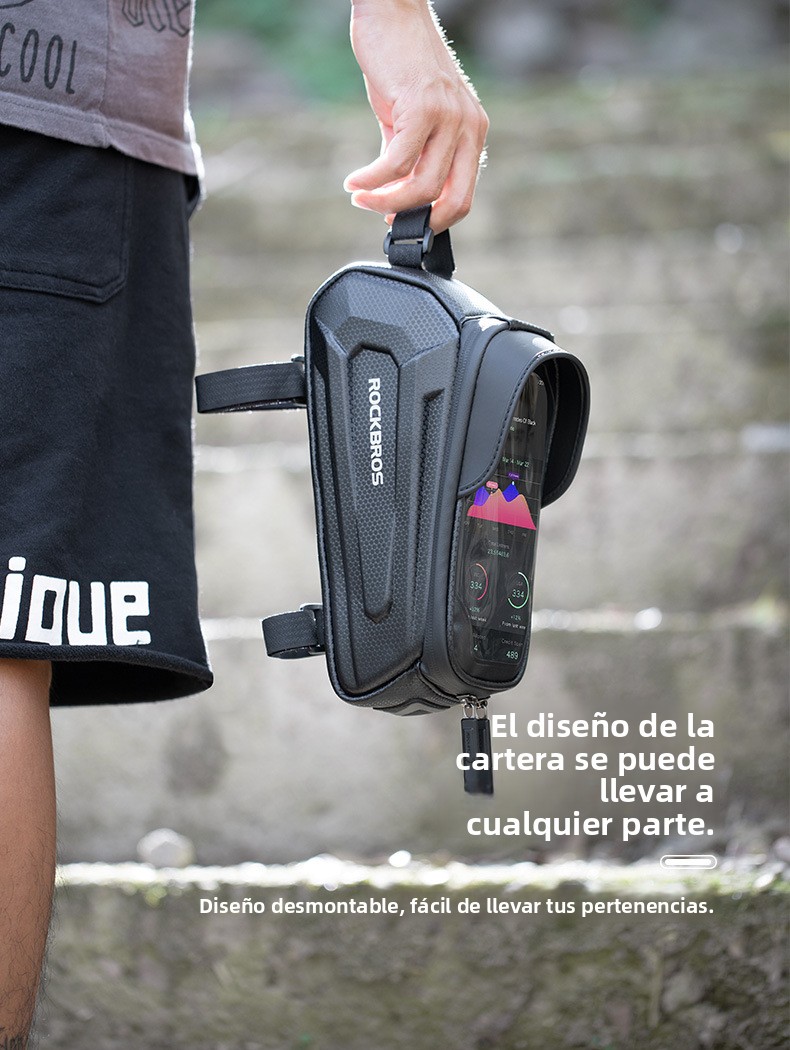 Esta bolsa para bicicleta se instala fácilmente en el tubo delantero, ofreciendo un espacio seguro para guardar accesorios y objetos personales durante tus rutas. Su pantalla táctil transparente permite manipular smartphones sin necesidad de sacarlos, facilitando el acceso a dispositivos en movimiento. Fabricada con materiales duraderos y de fácil limpieza, está diseñada para resistir las exigencias del ciclismo de montaña y carretera, garantizando funcionalidad y protección en cada salida.