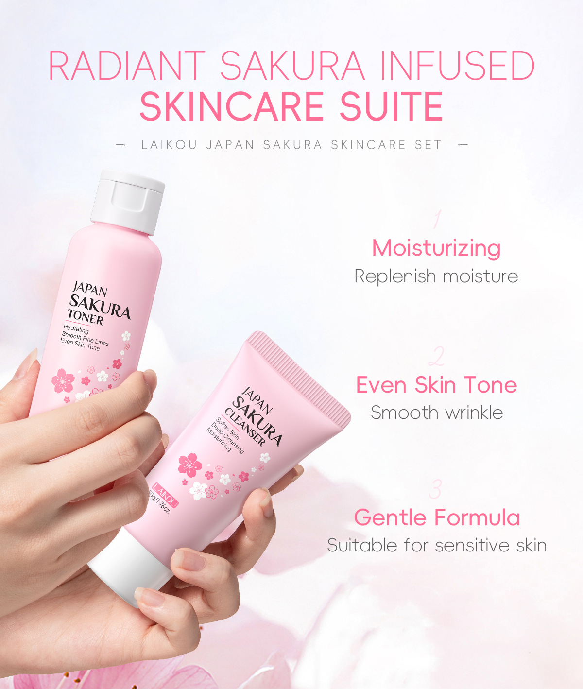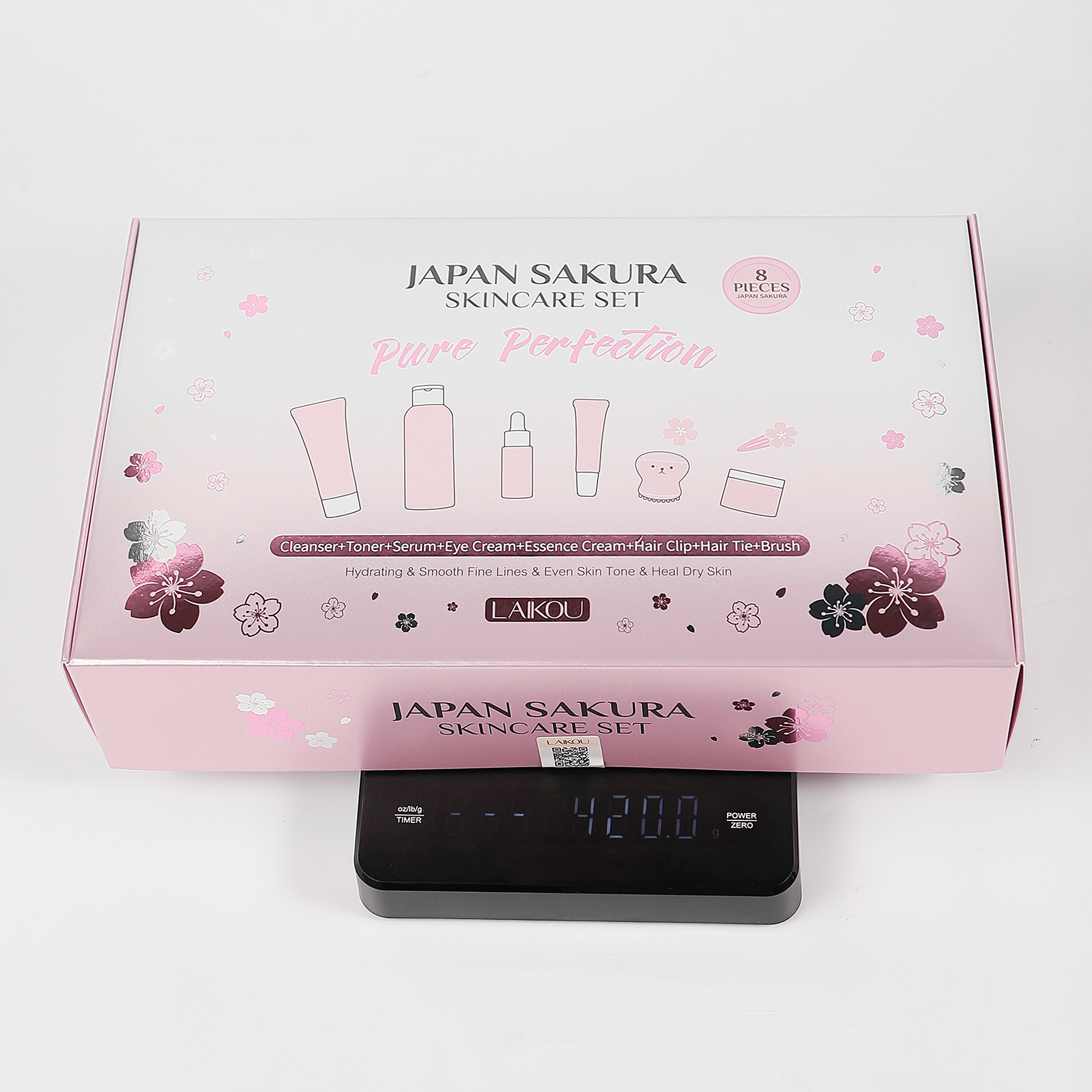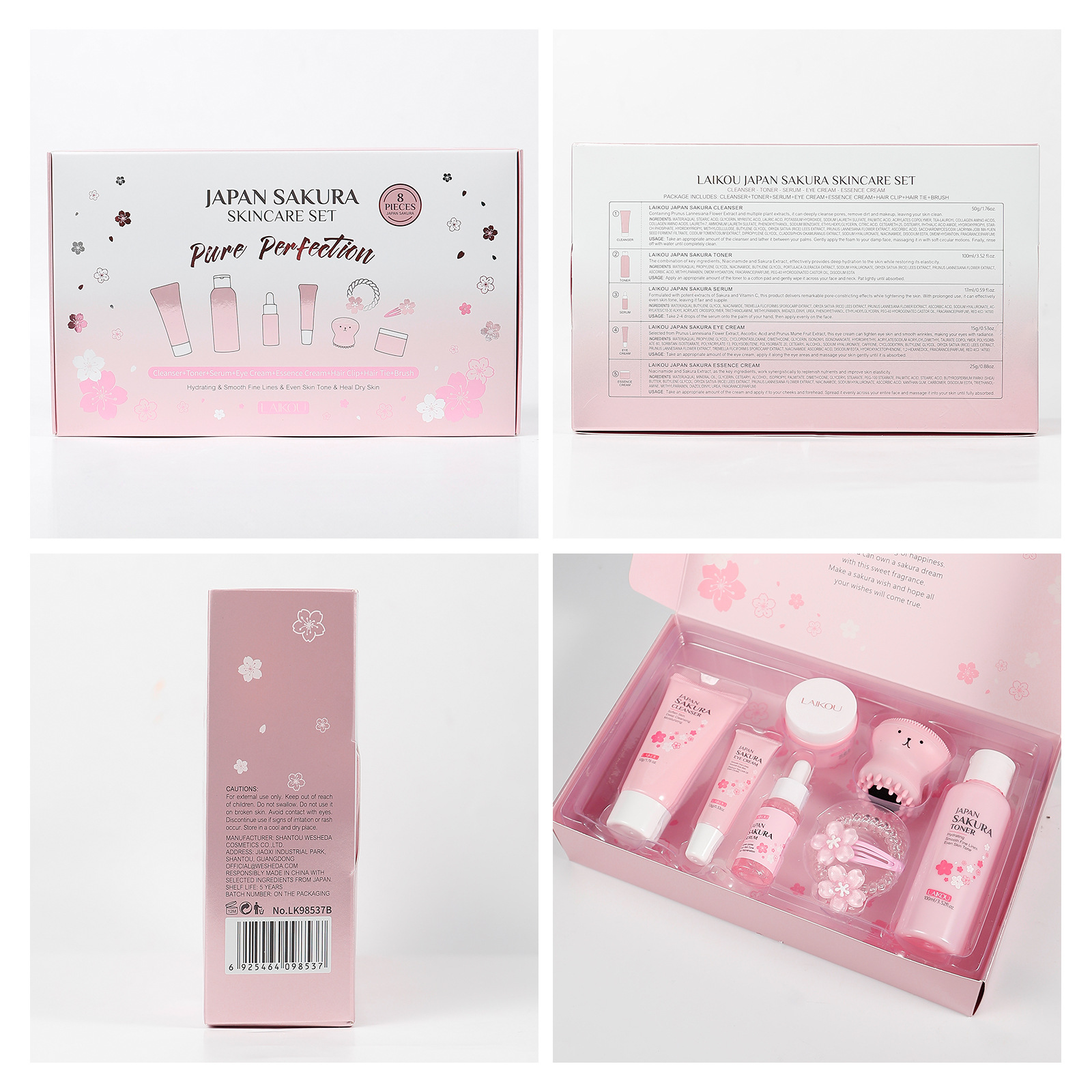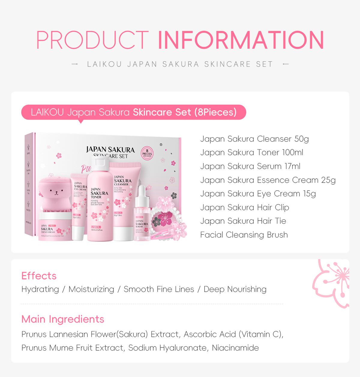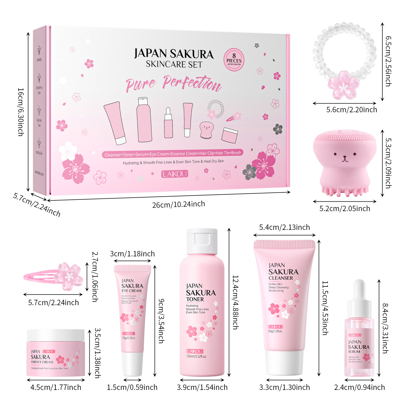 - 8 Pieces (Facial Cleanser 50g + Toner 100ml + Serum 17ml + Eye Cream 15g + Serum Cream 25g + Hair Clip + Headband + Pink Octopus)