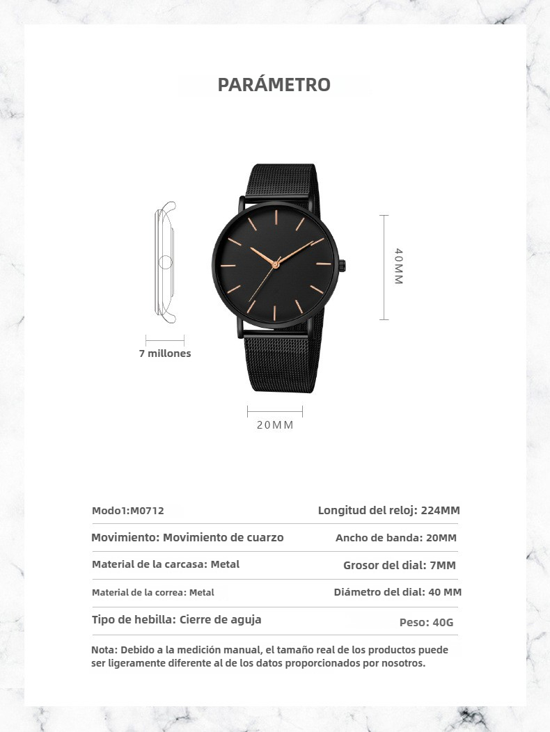 Reloj de pulsera de cuarzo con diseño ultrafino y correa de acero tipo malla. Estilo limpio para uso diario o eventos.