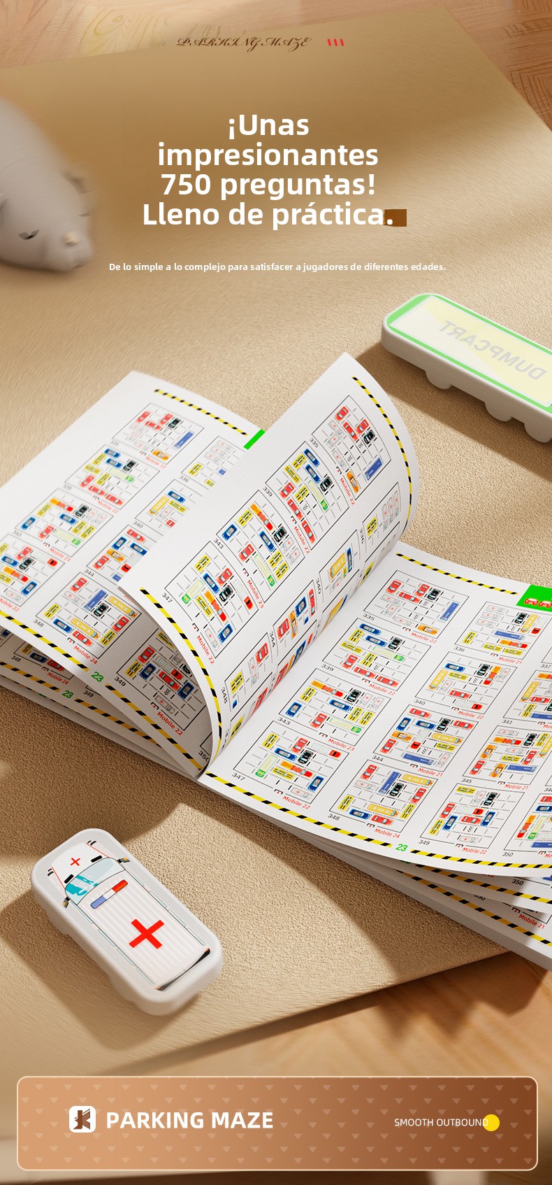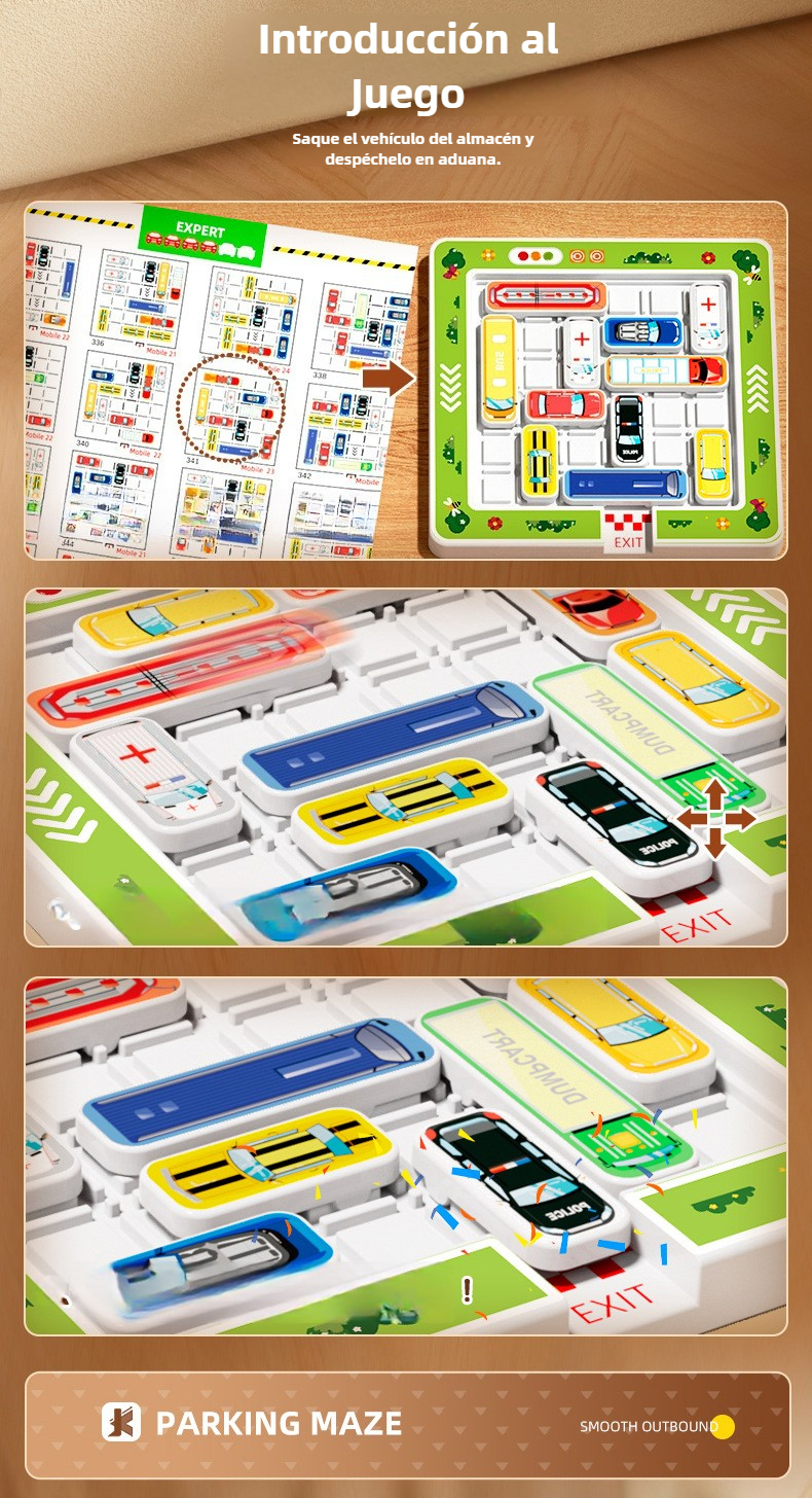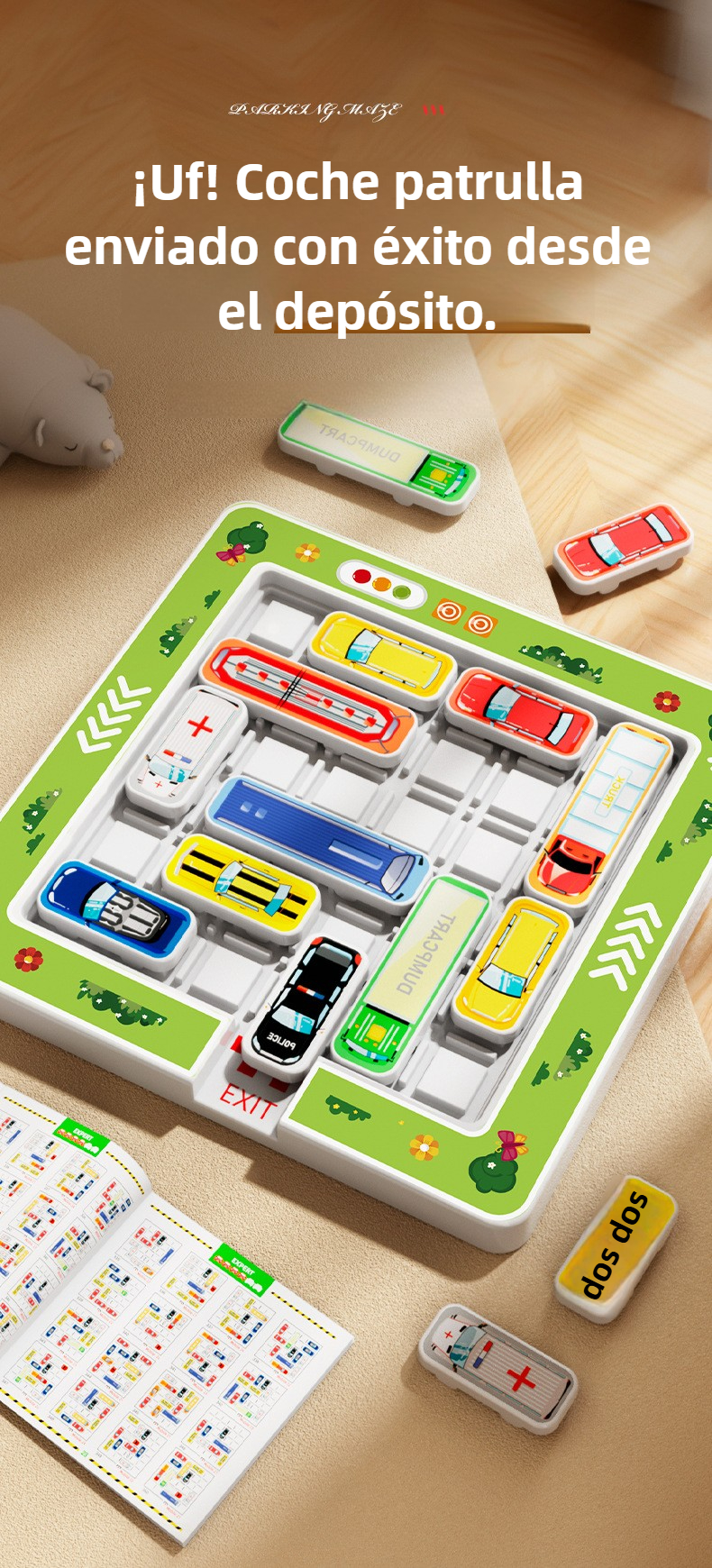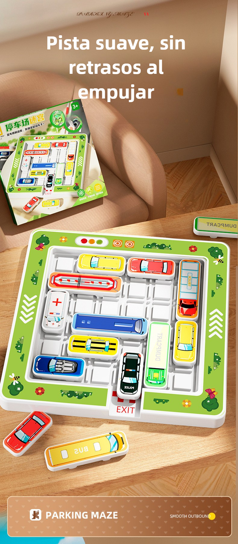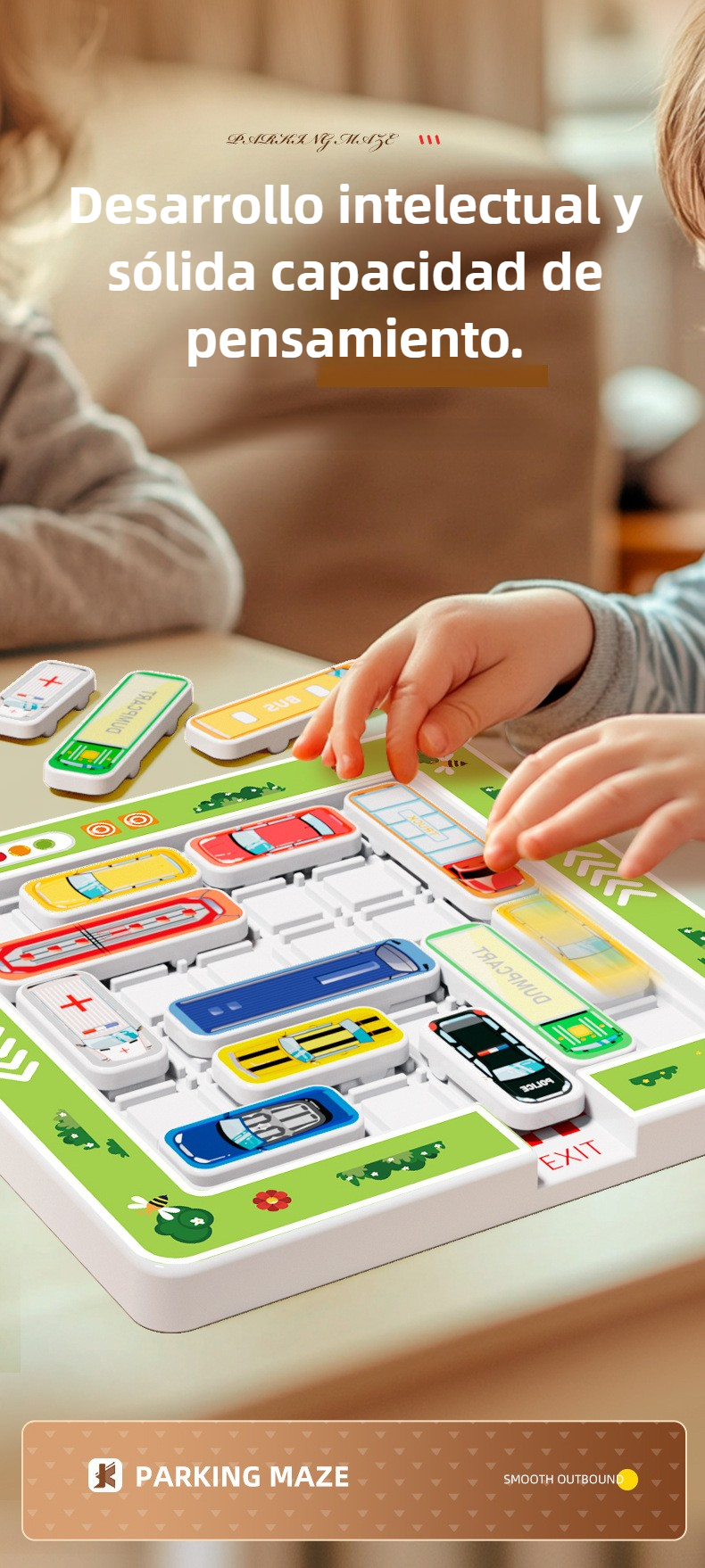 Tablero tipo estacionamiento donde los niños mueven autos para abrir paso a la salida. Desarrolla lógica, planificación y paciencia de forma divertida.