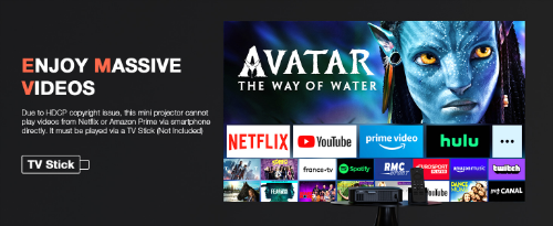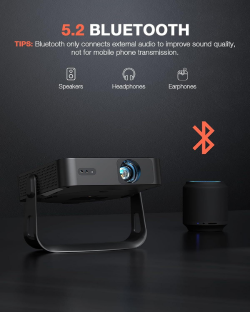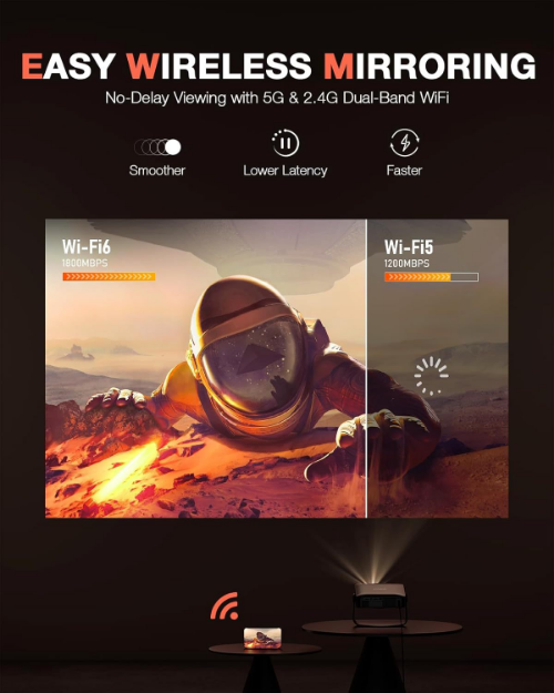 [WiFi 6 y Bluetooth 5.2 Ultrarrápidos] WiFi 6 garantiza una transmisión de señal estable y rápida, proporcionando una duplicación de pantalla inalámbrica sin interrupciones para experiencias fluidas de películas y juegos. El Bluetooth 5.2 integrado ofrece sincronización de audio perfecta, convirtiendo el proyector para exteriores en un altavoz Bluetooth para reproducir música desde su teléfono según desee. ¡Una experiencia inmersiva le espera! (Debido a restricciones de copyright HDCP, Netflix, Prime Video, Hulu, etc., solo se pueden reproducir a través de TV Stick, Roku, etc.)