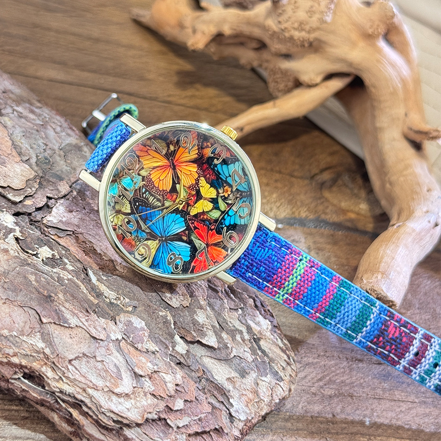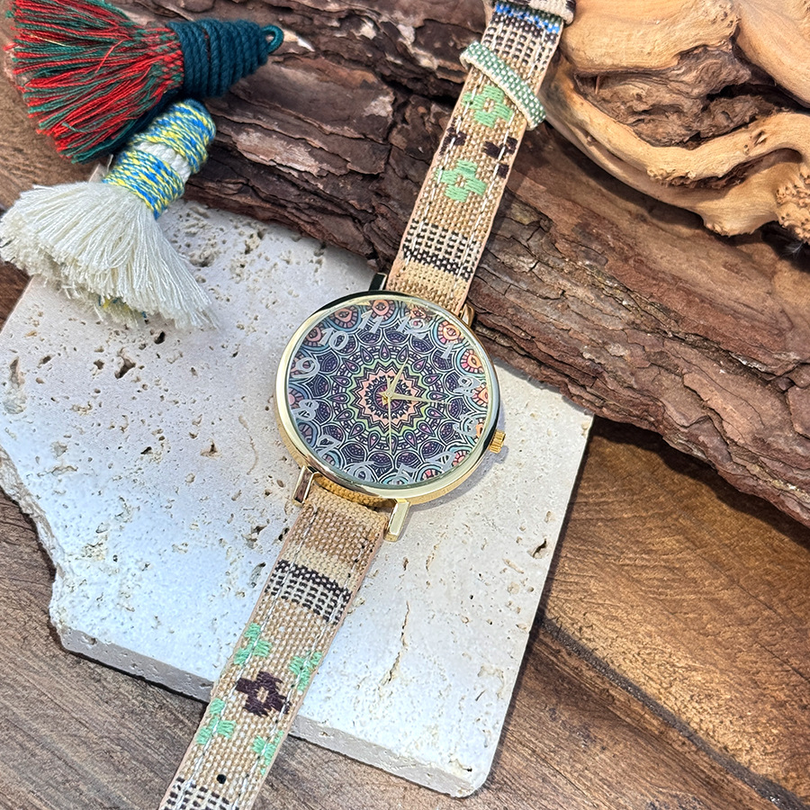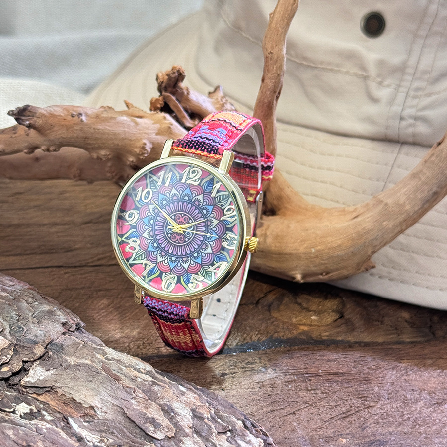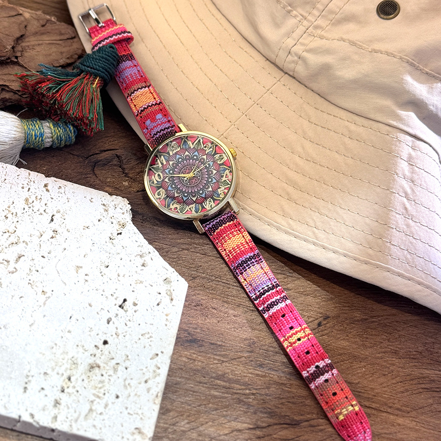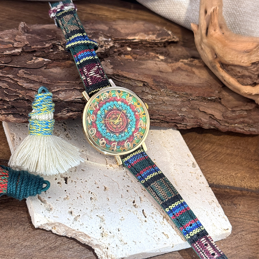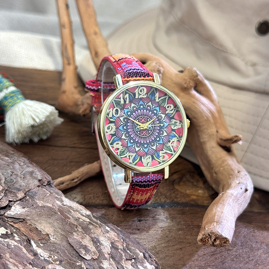 Reloj de cuarzo para mujer inspirado en el estilo bohemio y vintage. Correa de tejido étnico multicolor y carátulas artísticas con mandalas, mariposas y patrones retro. Ideal para looks casuales, boho y de festival.
