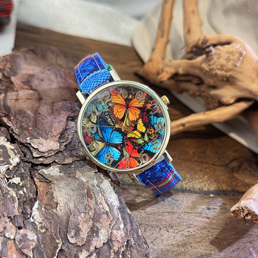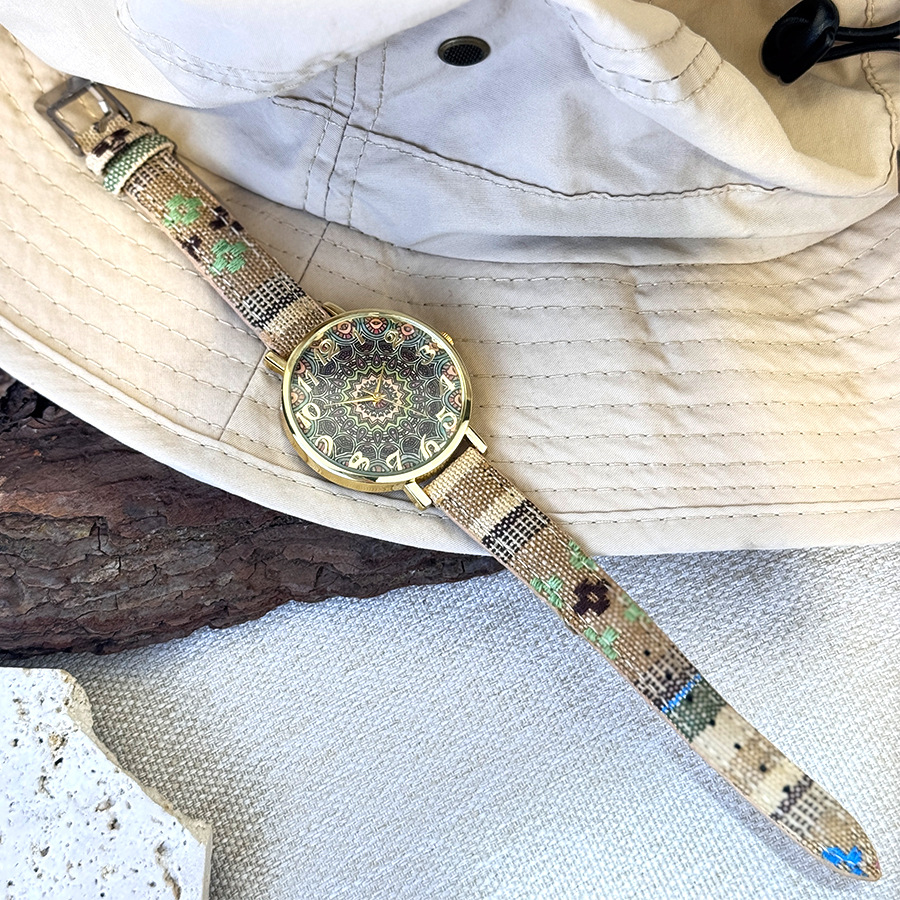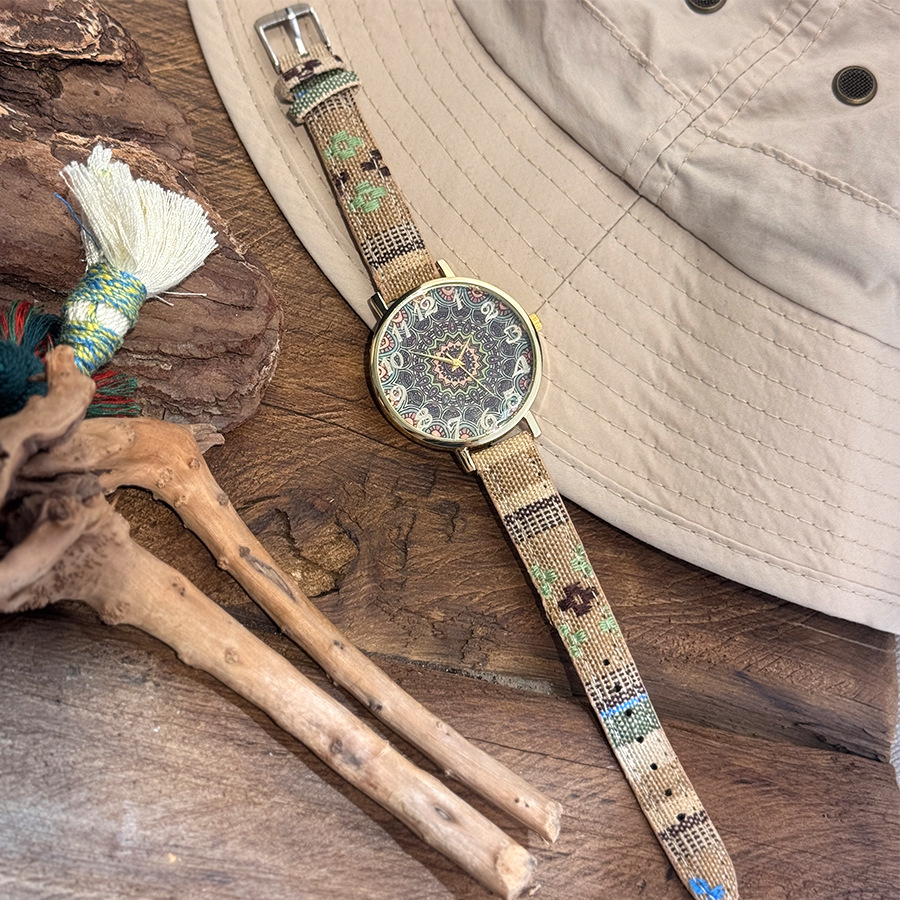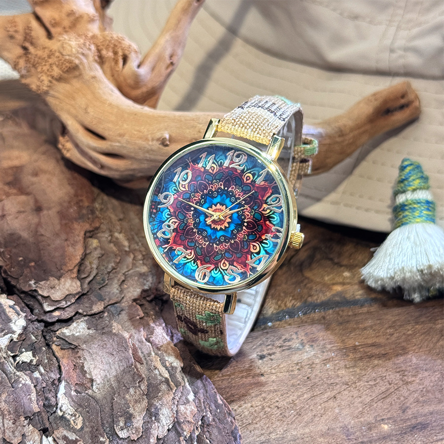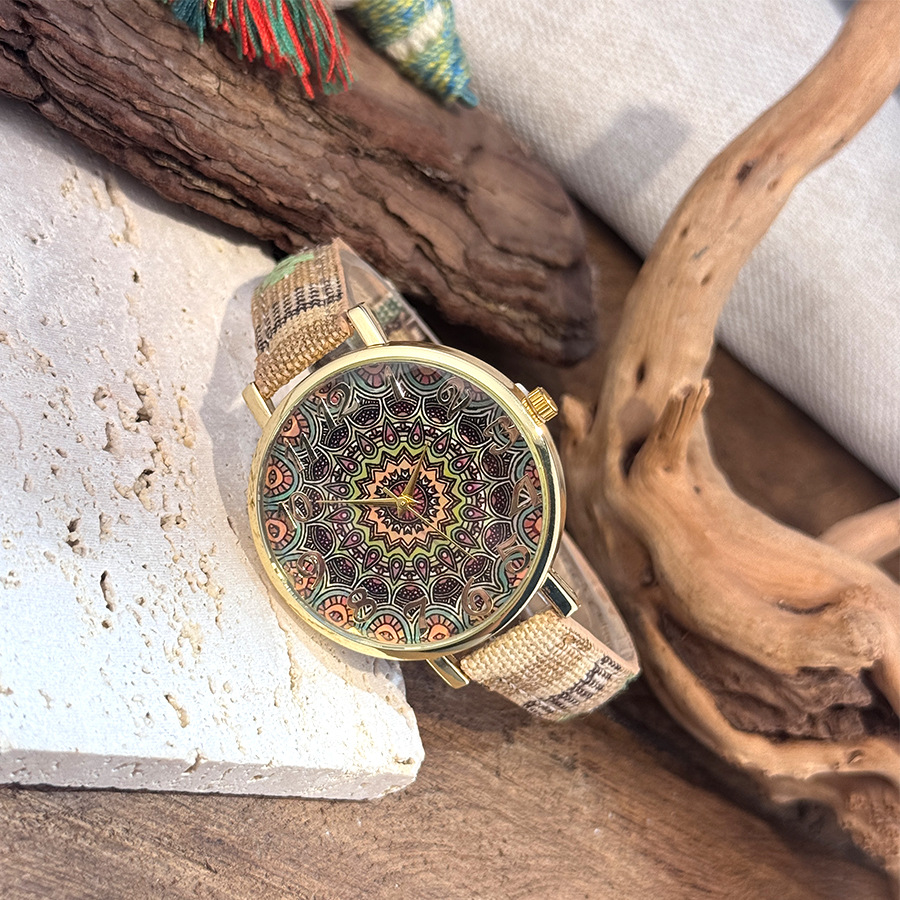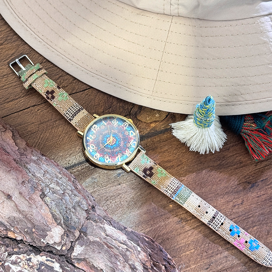 Reloj de cuarzo para mujer inspirado en el estilo bohemio y vintage. Correa de tejido étnico multicolor y carátulas artísticas con mandalas, mariposas y patrones retro. Ideal para looks casuales, boho y de festival.