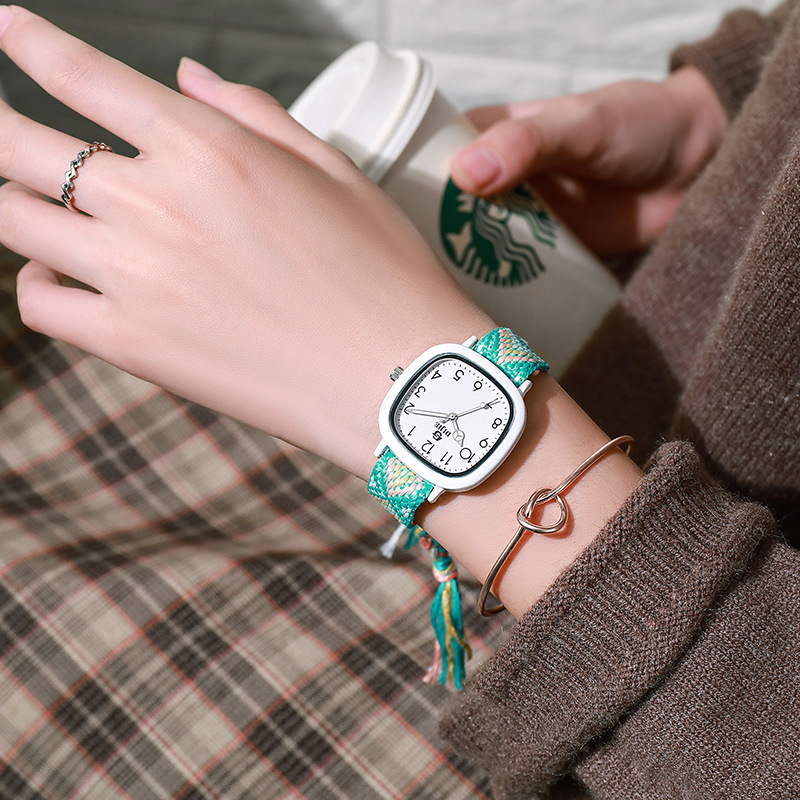 Reloj casual con correa tipo pulsera de amistad tejida a mano y caja compacta con esquinas redondeadas. Combina el estilo ins con vibra escolar y natural. Ligero, colorido y cómodo para todos los días.