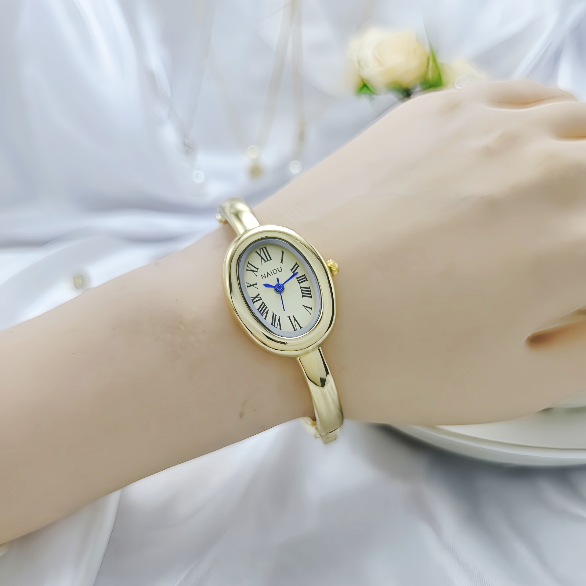 Reloj de cuarzo con caja ovalada y pulsera tipo brazalete. Estilo ligero y elegante, ideal para estudiantes y uso diario.
