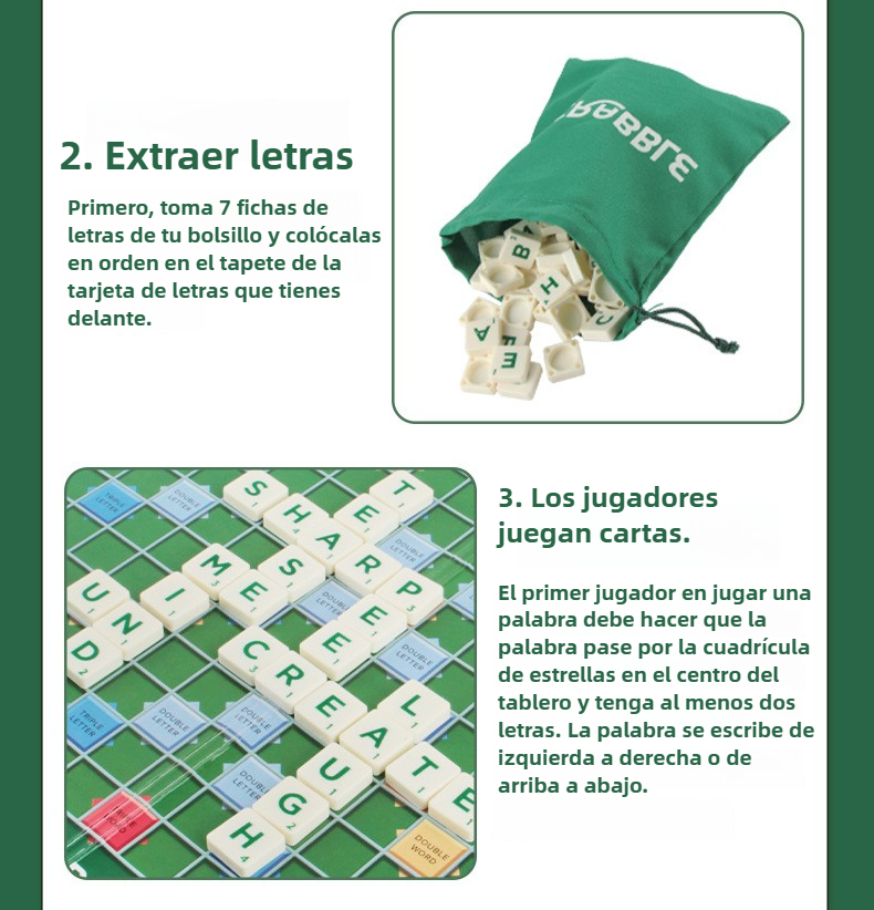 Contenido Tablero, fichas de letras, reglas y tarjetas de puntuación