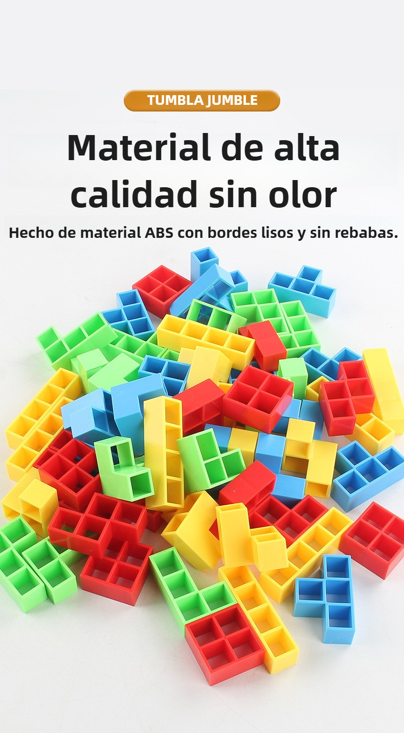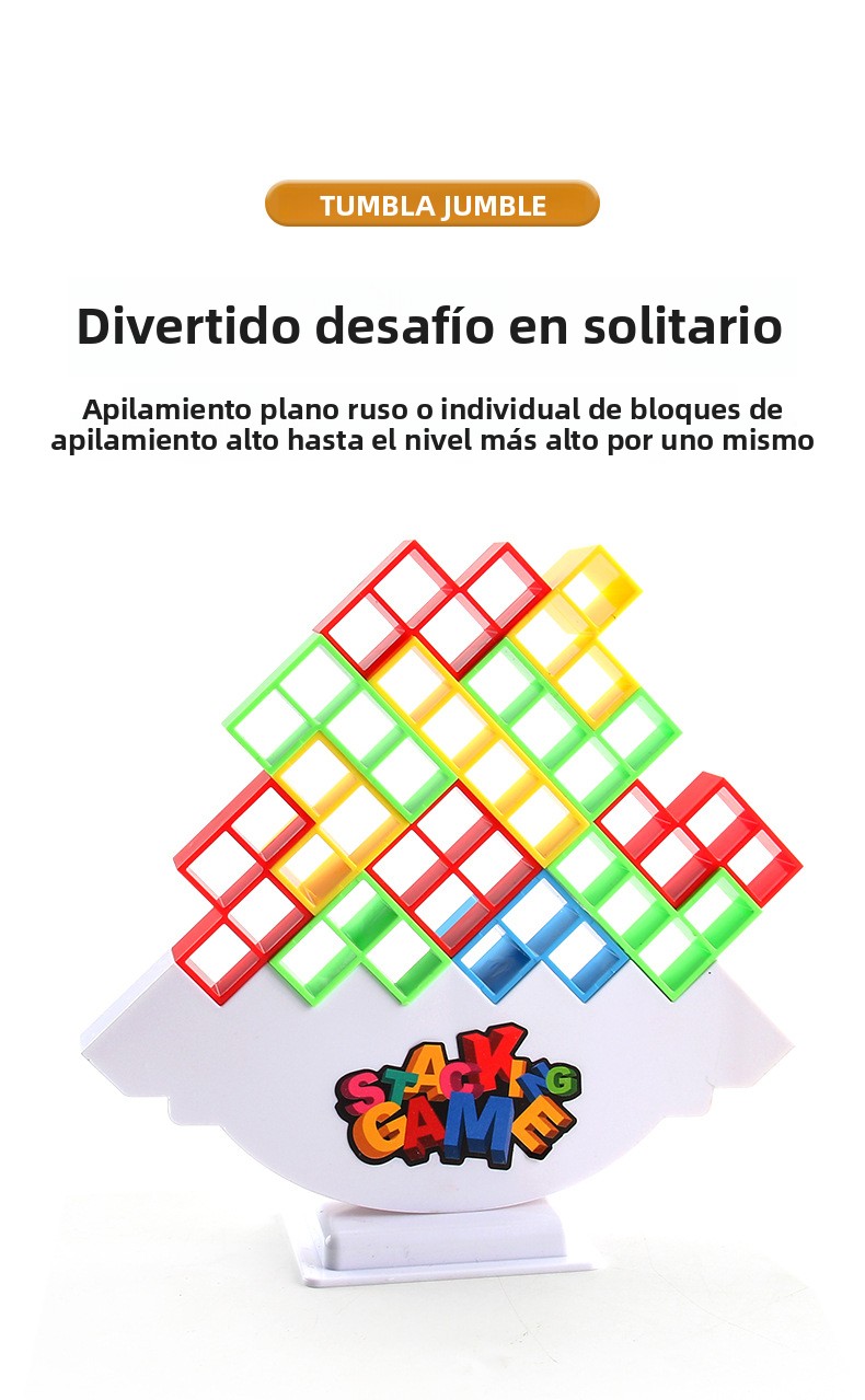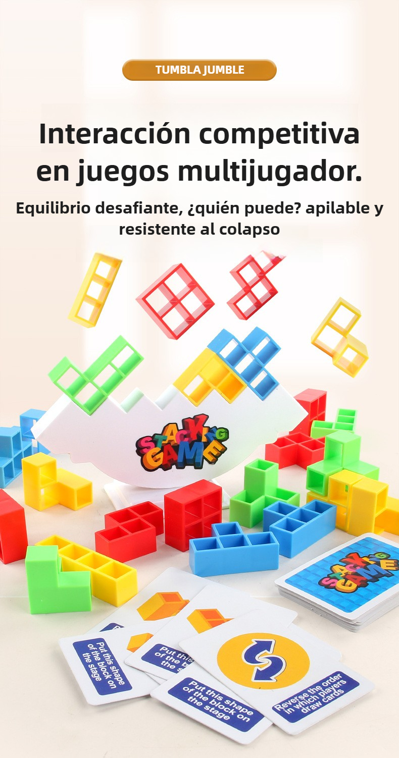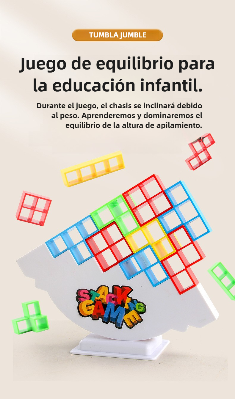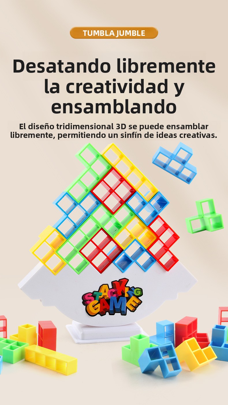 Juego de mesa interactivo para padres e hijos. Apila piezas tipo Tetris sin que se caigan, fomenta lógica, coordinación y trabajo en equipo.